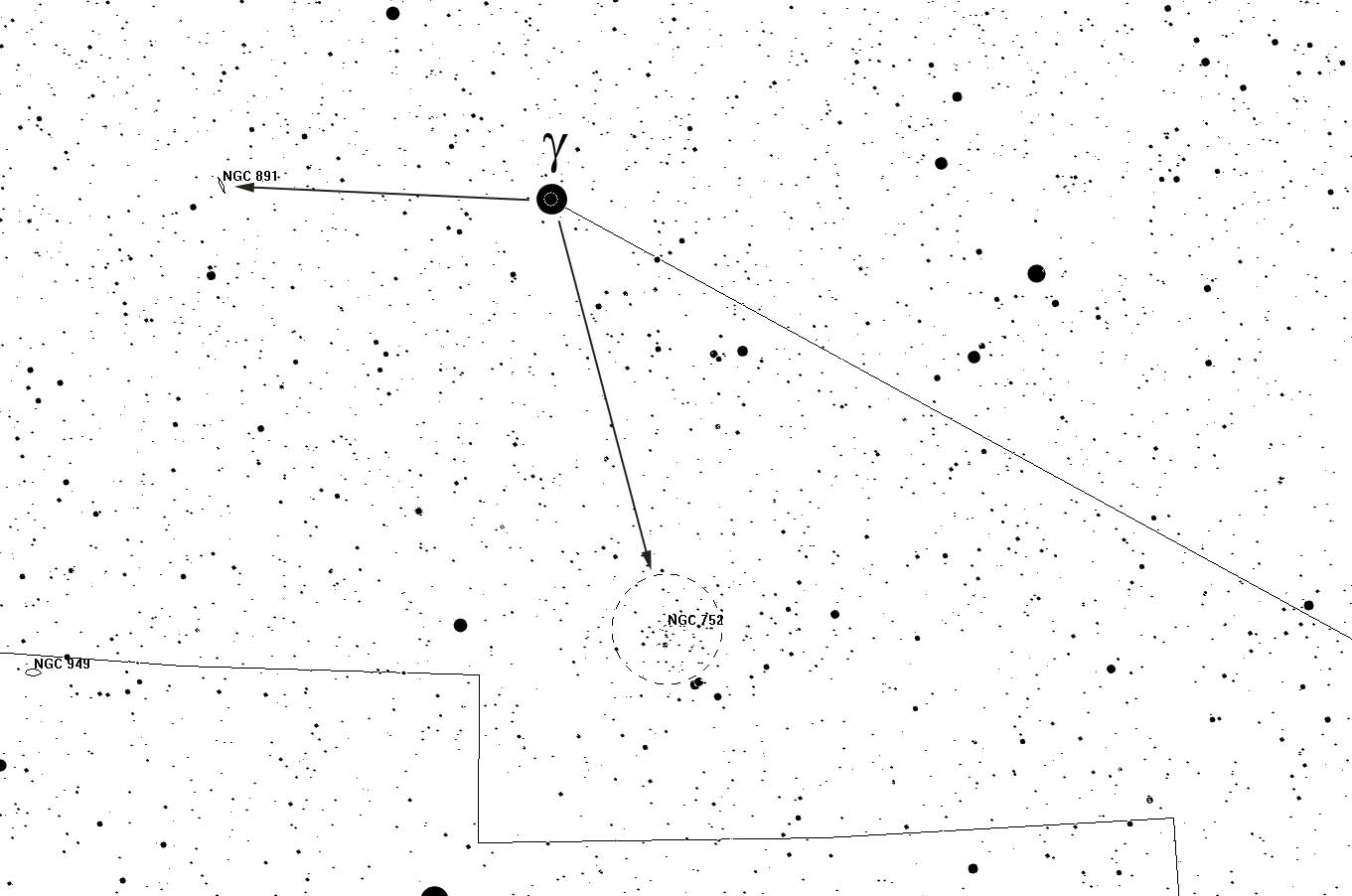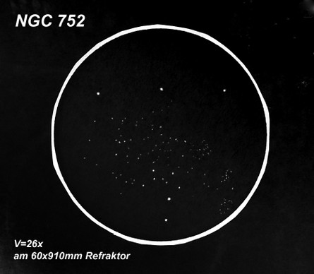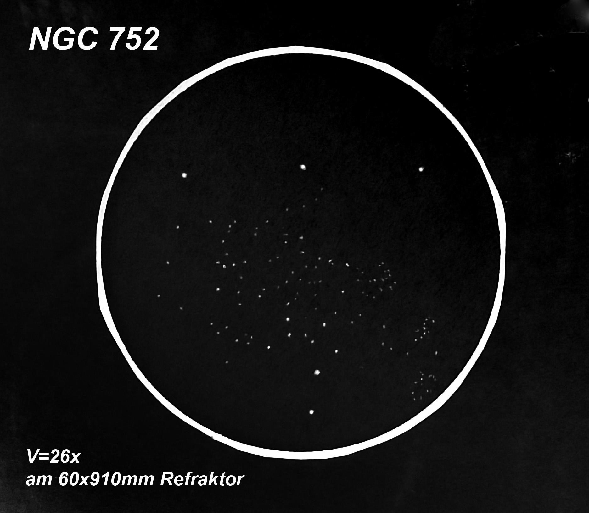 Einen schönen offenen Sternhaufen finden wir mit dem 10 x 50 Fernglas rund 4,6° südsüdwestlich vom Stern γ-And (Alamak). Er trägt die Katalogbezeichnung NGC 752 und wurde bereits vor 1654 vom sizilianischen Astronomen Giovanni Battista Hodierna beschrieben. Er hat einen Durchmesser von 19 Lichtjahren und ist 1.500 Lichtjahre von uns entfernt. Seine 60 Mitgliedssterne sind mittlerweile etwa 1,1 Milliarden Jahre alt. Mit meinem 2,5-Zöller war er bei V=26x ein großer, lockerer Haufen.