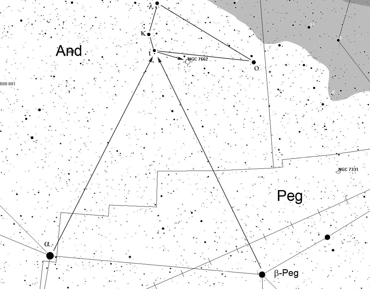 Unser letztes Ziel an diesem Abend finden wir 2,3° westlich vom Stern ι-And, der zusammen mit den Sternen λ-And, κ-And und δ-And eine auffällige drachenförmige Konstellation bildet. Etwas unterhalb der Verbindungslinie von ι-And und δ-And befindet sich der planetarische Nebel NGC 7662, der am 6. Oktober 1784 ebenfalls von Wilhelm Herschel entdeckt wurde. Er ist 5.750 Lichtjahre von uns entfernt und in seinem Zentrum befindet sich ein weißer Zwerg mit einer Oberflächentemperatur von 75.000 Kelvin, der hauptsächlich die blaue Sauerstoffhülle zum Leuchten anregt. Aus diesem Grund wird dieser planetarische Nebel auch „blauer Schneeball“ genannt. Schon mit meinem 2,5-Zöller war er bei einer Vergrößerung von 91x ein sehr helles und kugelförmiges Objekt! Mit meinem Achtzöller war er dann bei V=83xWw+OIII(-Filter) ein sehr heller, runder Fleck.