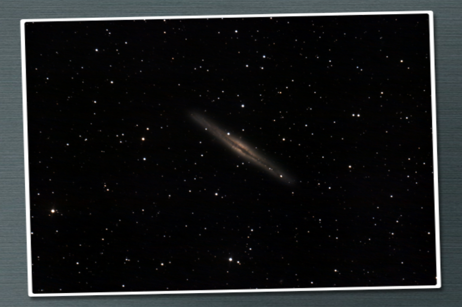 schmale und relativ große Galaxie ohne ausgeprägten Kern. Mit einem 17,5-Zöller