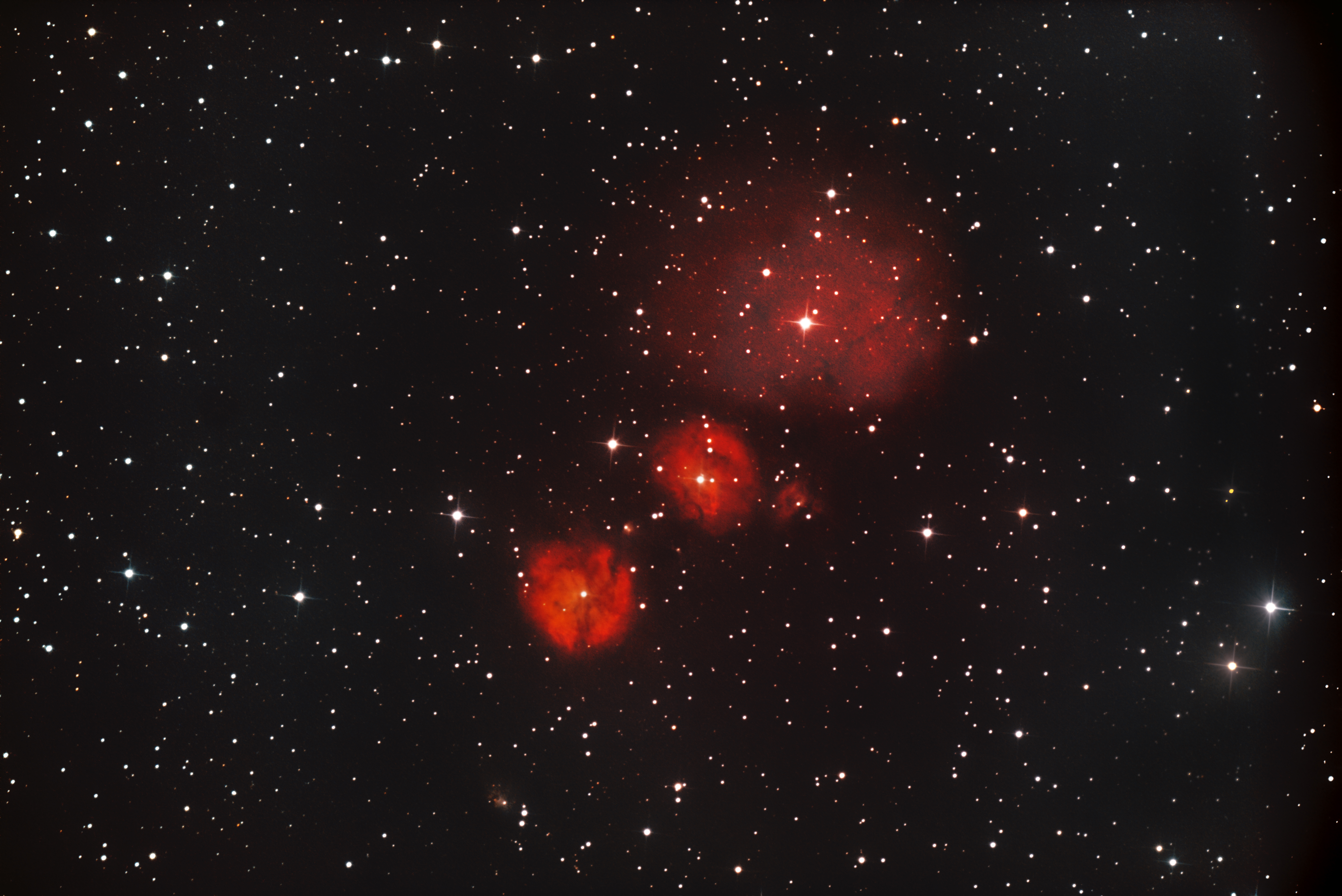 IC 2162 ist eine Gruppe von HII-Regionen, die auch mit den Sharpless-Nummern Sh2-255, Sh2-257 und Sh2-254 (von links unten nach rechts oben) katalogisiert sind. Sie sind jeweils 6.720, 5.000 und 6480 Lichtjahre von uns entfernt in den nördlichsten Bereichen des Sternbilds Orion. Die Katalognummer IC 2162 bezieht sich strenggenommen nur auf auf das Objekt Sh2-255. Entdeckt wurden diese Wasserstoffnebel in den 1890er Jahren von dem Astrofotografen Edward Emerson Barnard.