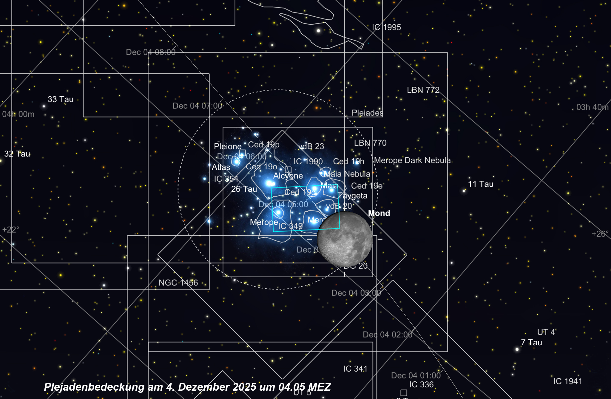 Auch im letzten Himmelsquartal des Jahres wird der Sternhaufen der Plejaden wieder vom Mond bedeckt! Am Morgen des 4. Dezember wird der fast volle Mond von Südwesten kommend nacheinander die Sterne des Sternhaufens bedecken. Um 04h05m MEZ wird er den Rand der Plejaden erreicht haben und beginnt seinen Weg über die Sterne. Gegen 06h15m MEZ wird er dann alle Sterne der Plejaden wieder freigegeben haben (siehe Abb.1).