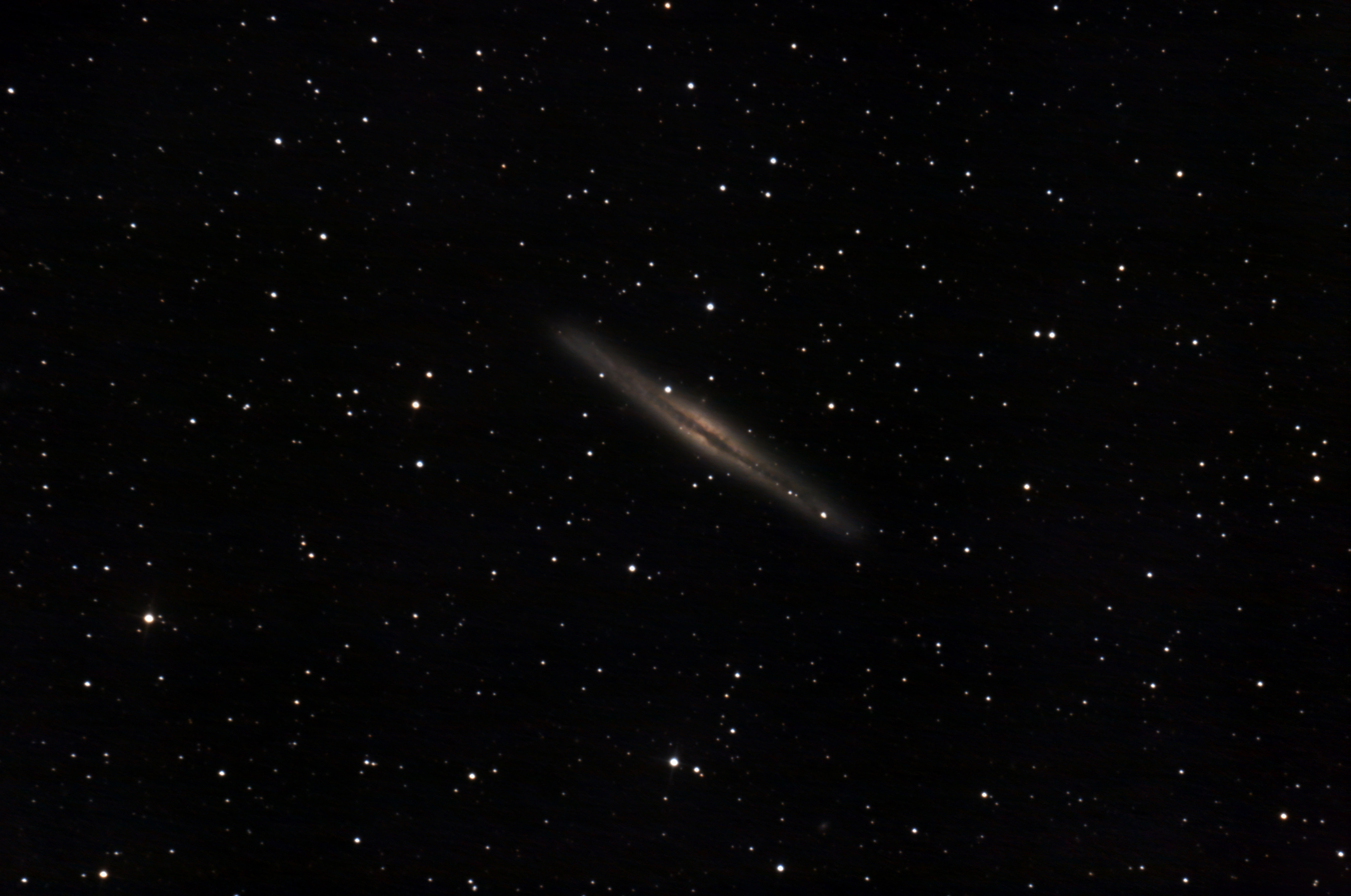 schmale und relativ große Galaxie ohne ausgeprägten Kern. Mit einem 17,5-Zöller