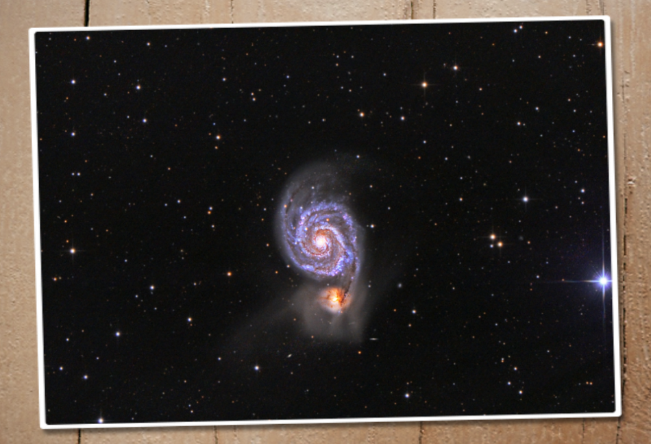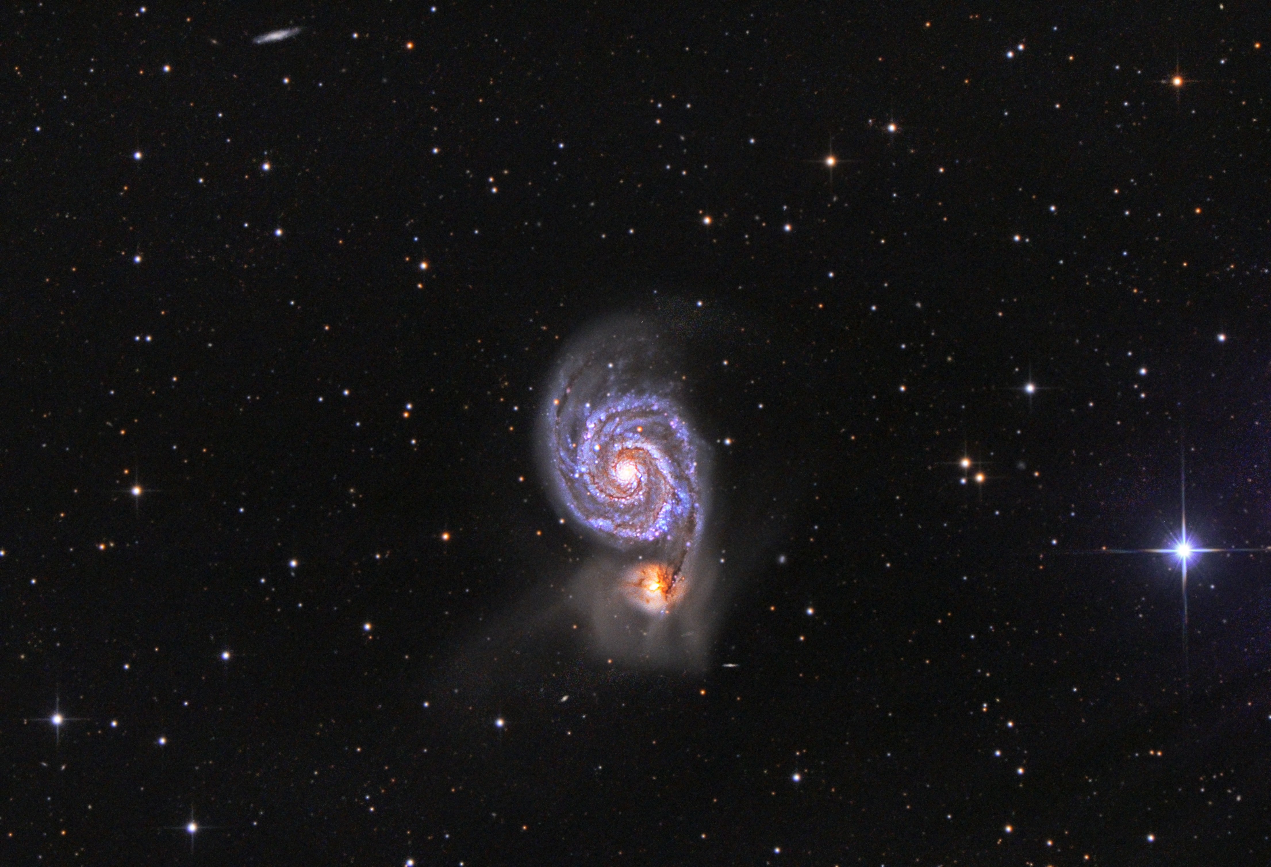 Die Whirlpool-Galaxie, auch bekannt als Strudelgalaxie, Messier 51, ist eine Spiralgalaxie im Sternbild Jagdhunde. Sie hat eine ausgeprägte Spiralstruktur. M 51 hat einen nahen Begleiter, NGC 5195, der eine irreguläre Galaxie ist. Die Wechselwirkung zwischen M 51 und NGC 5195 führt zu einer besonders aktiven Sternentstehung in M 51. Sie ist zudem eine der nächsten Galaxien mit einem aktiven galaktischen Kern. Im Zentrum der Galaxie befindet sich ein supermassereiches Schwarzes Loch. Die Aufnahme entstand im Zusammenhang mit der Volkssternwarte Langwedel und wurde mit einem Newton Teleskop, 200mm Öffnung, 800 mm Brennweite, gemacht.