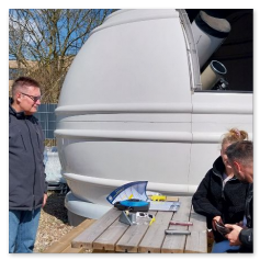 Pünktlich um 11.23 Uhr begann sich der Neumond vor die Sonne zu schieben. Strahlend blauer Himmel, der nur gelegentlich durch kleinere Wolkengruppen gestört wurde, lockte viele interessierte Besucher zur Volkssternwarte Langwedel e.V., die das Ereignis der partiellen Sonnenfinsternis an verschiedenen Teleskopen und auch mit Finsternisbrillen bewundern konnten. Zum Maximum um 12.15 Uhr wurde auch eine Sonnenfleckengruppe teilweise vom Mond bedeckt. Bei relativ ruhiger Luft konnte bei genauerer Betrachtung des Mondrands das Profil der Mondoberfläche erkannt werden, was man auf der Aufnahme unseres Mitglieds Norbert Tesch gut sehen kann! Zusätzlich bekamen die Gäste von den Mitgliedern der Sternwarte viele Informationen über das Ereignis und die Sternwarte.
