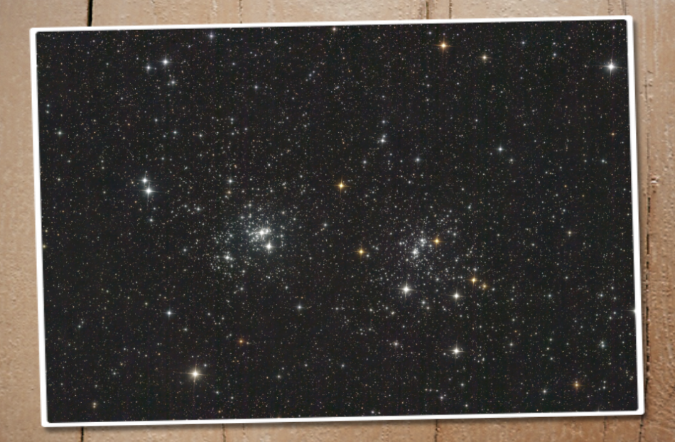 Der Doppelsternhaufen NGC 869/ NGC 884 im Sternbild Perseus ist besser bekannt als h und χ (sprich: Ha und Chi). Alte Aufzeichnungen des griechischen Astronomen Hipparchus belegen, dass h und χ Persei schon vor über 2000 Jahren gesichtet wurden. Allerdings erkannte erst der englische Astronom John Flamsteed im 18. Jahrhundert, dass es sich um offene Sternhaufen handelt. Der Doppelsternhaufen kann bereits mit dem bloßen Auge gesehen werden. Selbst unter einem aufgehellten Landhimmel sieht man zwischen Kassiopeia und Perseus einen nebligen Fleck, der bei genauer Betrachtung länglich und zweigeteilt erscheint. Im Teleskop zeigen sich zwei leuchtende Sternhaufen, dicht besetzt mit blauweißen, jungen Sternen. Darüber hinaus sieht man einige veränderliche Rote Riesensterne mit oranger Färbung. Dieser Farbkontrast der Sterne macht sich gut auf Astrofotografien.