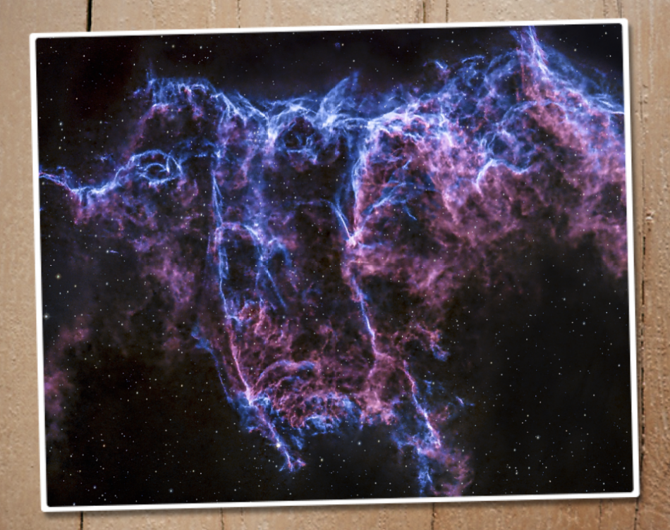Dieses Foto des Fledermausnebel, NGC 6995, ist eine Detailaufnahme des Cirrusnebels - einem Supernovaüberrest, der vor etwa 8.000 Jahren aus der Explosion eines massereichen Sterns hervorgegangen ist. Der Cirrusnebel ist 1.400 Lichtjahre von uns entfernt und hat sich mittlerweile auf 3 Grad (6 Vollmonddurchmesser) ausgedehnt! Der Fledermausnebel bedeckt am Sternhimmel aber nur die Größe des Vollmondes.