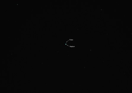 Aufgrund von Berechnungen des Mathematikers Urbain Le Verrier entdeckte 1846 der deutsche Astronom Johann Gottfried Galle den äußersten Planeten Neptun. Er ist rund 4,5 Milliarden Kilometer von der Erde entfernt und mit einem Durchmesser von 50.000 Kilometer rund viermal so groß wie die Erde. Mit seiner großen Masse beeinflusst Neptun die Umlaufbahnen der Himmelskörper im Kuipergürtel. Für einen Umlauf um die Sonne benötigt er rund 165 Jahre (Neptunjahr). Mit rund 16 Stunden Rotationszeit dreht sich auch Neptun wie die anderen drei Gasplaneten sehr rasch um seine Achse, was zur Folge hat, dass sein Poldurchmesser um 1.000 Kilometer geringer ist als sein Äquatordurchmesser und seine Wolken ebenfalls zu Bändern in die Länge gezogen sind. In der bläulichen Atmosphäre des Neptun sind mit Raumsonden wie Voyager 2 im sichtbaren Licht etwas mehr Strukturen sichtbar als bei Uranus. Allen voran ist auch bei ihm ein sogenannter „Großer Dunkler Fleck“ entdeckt worden, den das Hubble-Teleskop 1994 nicht mehr auffinden konnte. Allerdings wurde in der nördlichen Hemisphäre ein neuer ähnlicher Fleck aufgefunden. Des Weiteren können des Öfteren weiße Eiskristallwolken aus Methan beobachtet werden. Nach Jupiter, Saturn und Uranus ist er also der viertgrößte Planet des Sonnensystems und wurde nach dem römischen Gott des Meeres und der Fließgewässer benannt. Neptun besitzt 14 bekannte Monde, wovon Triton mit 2.700 Kilometer Durchmesser der größte ist. Ihn kann man auch mit etwas größeren Amateurteleskopen beobachten, wie er seine Runden um Neptun zieht. Auf dem Neptunscheibchen kann man mit Amateurteleskopen keine Einzelheiten mehr erkennen, da sein scheinbarer Durchmesser von der Erde aus gesehen nicht größer als 2,3 Bogensekunden wird. Er ist der einzige große Planet des Sonnensystems, der nicht mit dem bloßen Auge beobachtet werden kann.