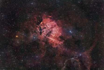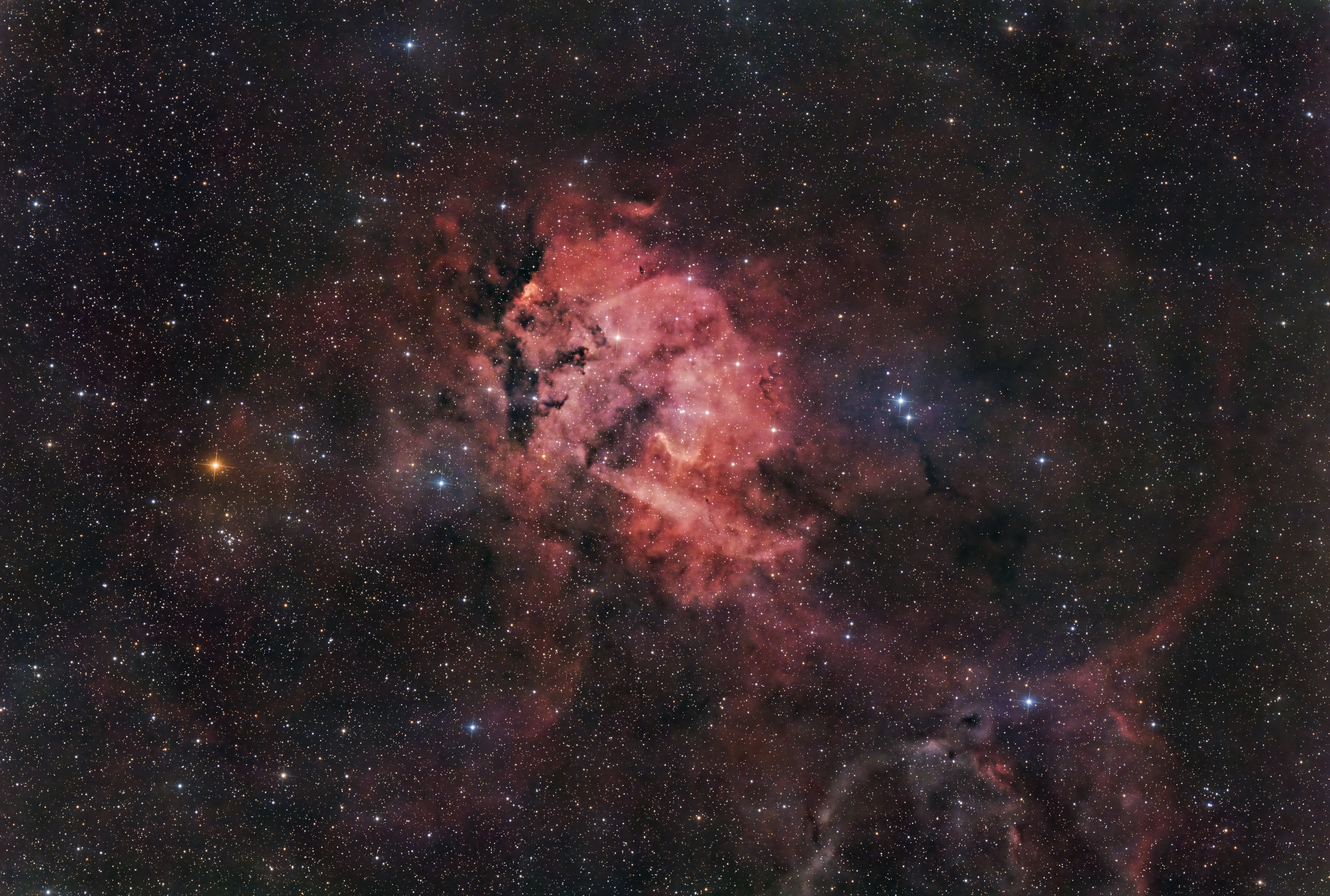 Der Löwennebel SH2-132 ist ein Emissionsnebel, der sich im Sternbild Kepheus befindet. Er ist ungefähr 10400 Lichtjahre von uns entfernt. Seine Form erinnert an einen Löwen, was ihm seinen Namen eingebracht hat. Die Energie, die die großen Wasserstoffwolken im Nebel in einem intensiven Rot zum Leuchten bringt, stammt von mehreren massereichen Sternen. Diese Wolken sind die Geburtsstätte neuer Sterne. Im Kontrast zu den Wasserstoffwolken sind dunkle Staubwolken (LDN) zu sehen, die das Licht der Sterne teilweise abschatten. Im Inneren des Nebels sind komplexe Strukturen (Filamente und Bögen) zu sehen, die die dynamischen Prozesse im Nebel anzeigen. Weitere Informationen zu diesem schönen Nebel findet der Leser hier.