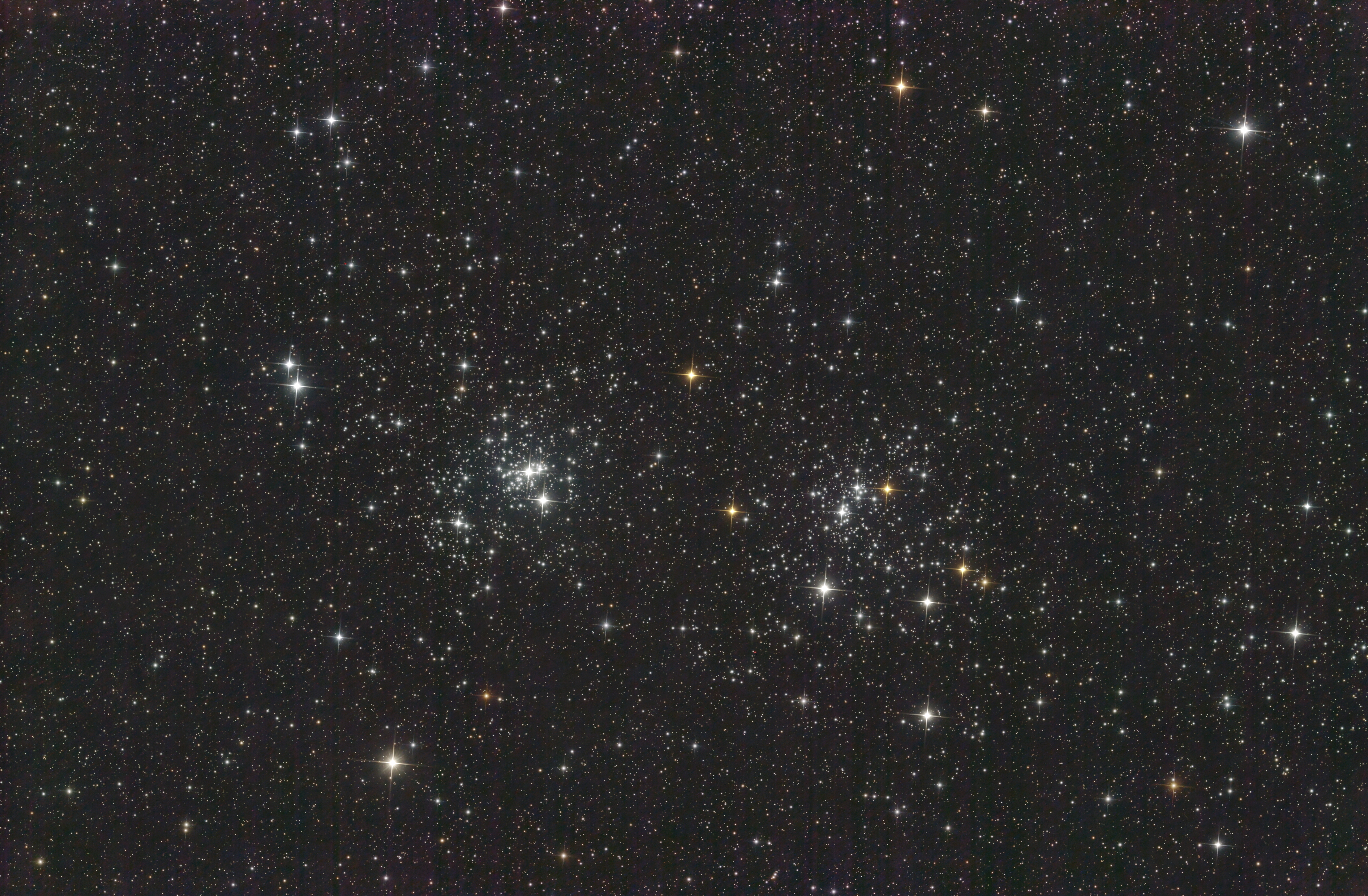Der Doppelsternhaufen NGC 869/ NGC 884 im Sternbild Perseus ist besser bekannt als h und χ (sprich: Ha und Chi). Alte Aufzeichnungen des griechischen Astronomen Hipparchus belegen, dass h und χ Persei schon vor über 2000 Jahren gesichtet wurden. Allerdings erkannte erst der englische Astronom John Flamsteed im 18. Jahrhundert, dass es sich um offene Sternhaufen handelt. Der Doppelsternhaufen kann bereits mit dem bloßen Auge gesehen werden. Selbst unter einem aufgehellten Landhimmel sieht man zwischen Kassiopeia und Perseus einen nebligen Fleck, der bei genauer Betrachtung länglich und zweigeteilt erscheint. Im Teleskop zeigen sich zwei leuchtende Sternhaufen, dicht besetzt mit blauweißen, jungen Sternen. Darüber hinaus sieht man einige veränderliche Rote Riesensterne mit oranger Färbung. Dieser Farbkontrast der Sterne macht sich gut auf Astrofotografien.