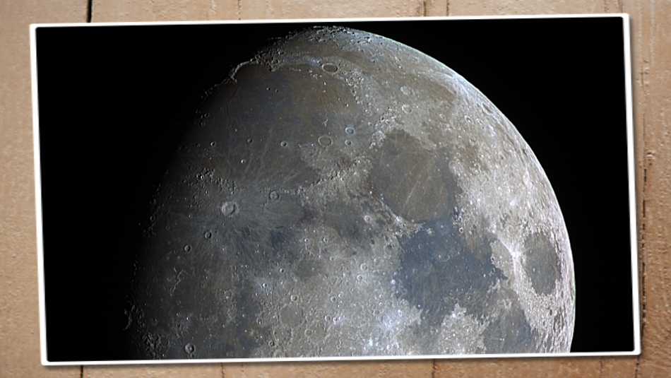 Die Mondoberfläche mit dem großen Krater Kopernikus (D=80 Kilometer) im linken Bildbereich und der sichelförmigen Regenbogenbucht (Sinus Iridum) im oberen Bildbereich. Die leicht gefärbte Oberfläche zeigt Gebiete mit unterschiedlichen Materialien.