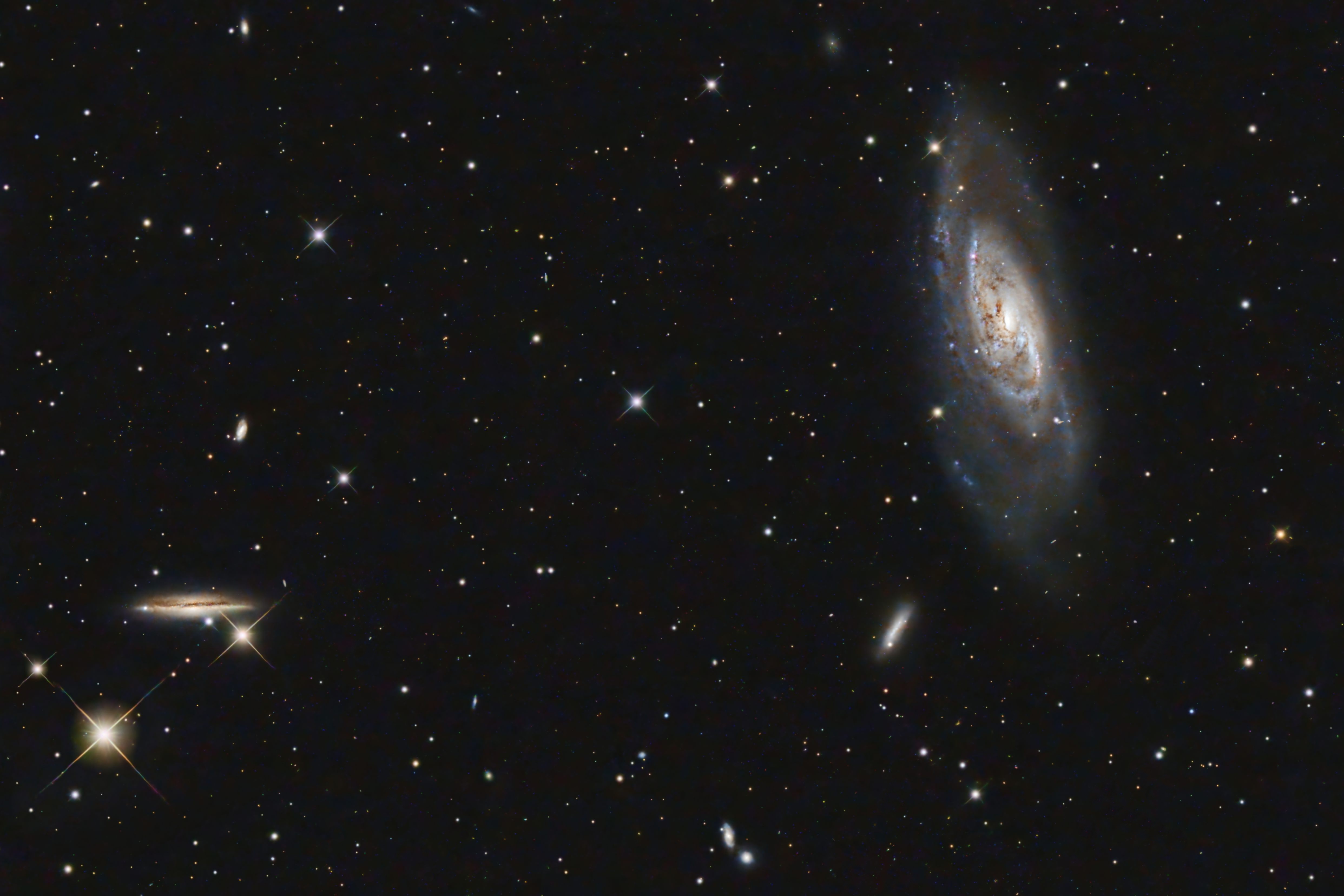 Messier 106 oder NGC 4258 ist eine Balken-Spiralgalaxie. Sie ist etwa 3,5 Millionen Lichtjahre entfernt und hat einen Durchmesser von etwa 80.000 Lichtjahren. Die Galaxy liegt im Sternbild Jagdhunde (Canis Venatici) in der Nähe der Deichsel des Großen Wagen. Die beiden Spiralarme sind durch große Mengen an jungen, massereichen Sternen gekennzeichnet, die in einem bläulichen Licht leuchten. Die Galaxie durchläuft derzeit einen sogenannten »Starburst«, bei dem die Sternentstehungsrate stark erhöht ist. Die nächstgrößere Galaxie im Bild ist NGC4217 und wurde 1788 von Wilhelm Herschel entdeckt.
