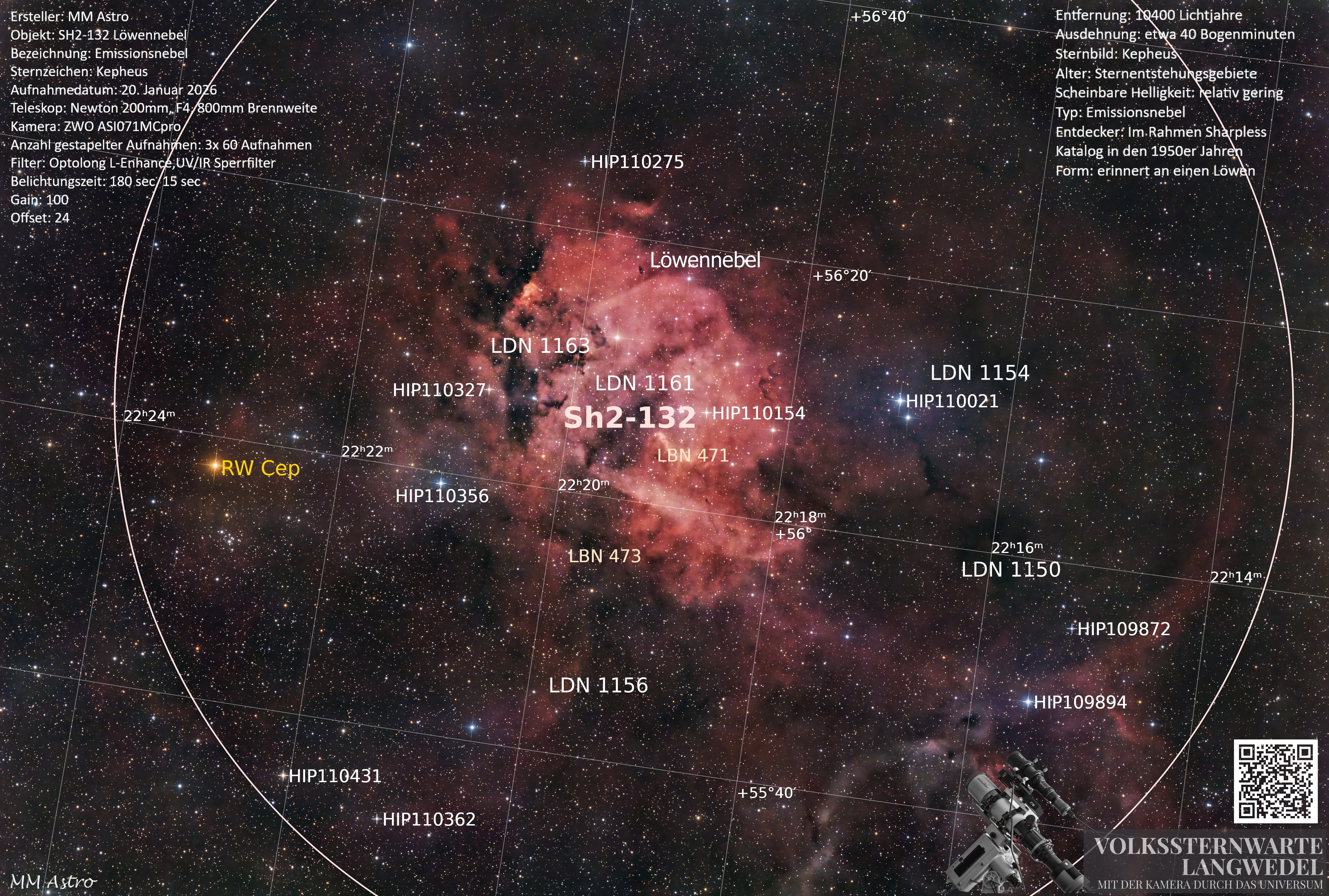 Der Löwennebel SH2-132 ist ein Emissionsnebel, der sich im Sternbild Kepheus befindet. Er ist ungefähr 10400 Lichtjahre von uns entfernt. Seine Form erinnert an einen Löwen, was ihm seinen Namen eingebracht hat. Die Energie, die die großen Wasserstoffwolken im Nebel in einem intensiven Rot zum Leuchten bringt, stammt von mehreren massereichen Sternen. Diese Wolken sind die Geburtsstätte neuer Sterne. Im Kontrast zu den Wasserstoffwolken sind dunkle Staubwolken (LDN) zu sehen, die das Licht der Sterne teilweise abschatten. Im Inneren des Nebels sind komplexe Strukturen (Filamente und Bögen) zu sehen, die die dynamischen Prozesse im Nebel anzeigen. Weitere Informationen zu diesem schönen Nebel findet der Leser hier.